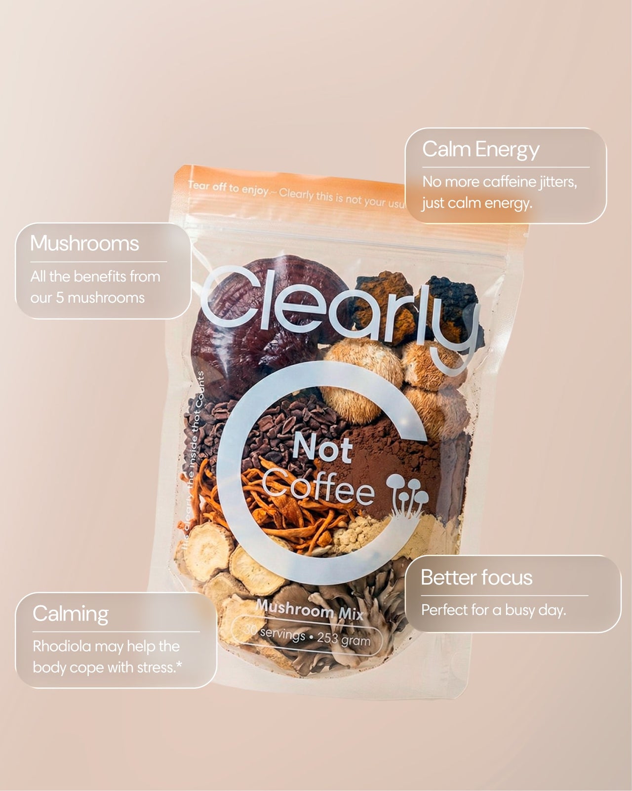 Not Coffee“Nutritional facts and ingredients label for Clearly Not Coffee Original, showing cacao, Lion’s Mane, Cordyceps, Chaga, Rhodiola and other natural extracts.”