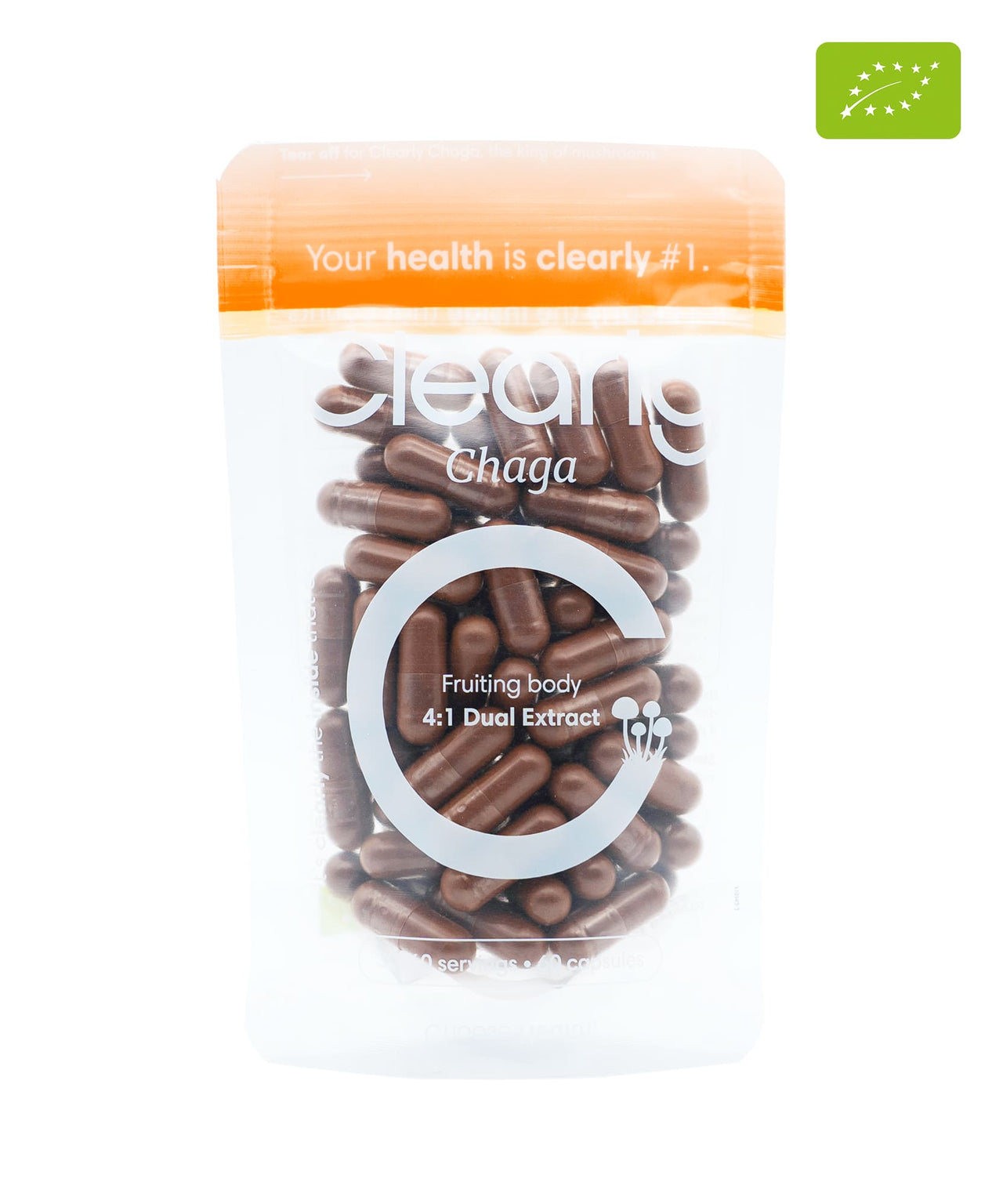 Organic Clearly Chaga capsules in a clear bottle, showcasing the dietary supplement for immune support and wellness.